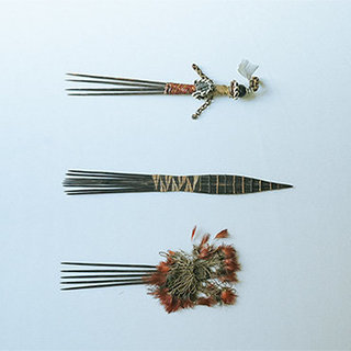 上の櫛は串状の棒を束ね、装飾には白貝を、先端には羽飾りがついています。