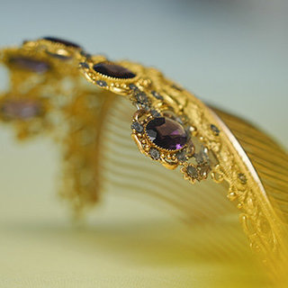 紫色のアメジストを配したティアラのようなデザインは豪華でありながら、